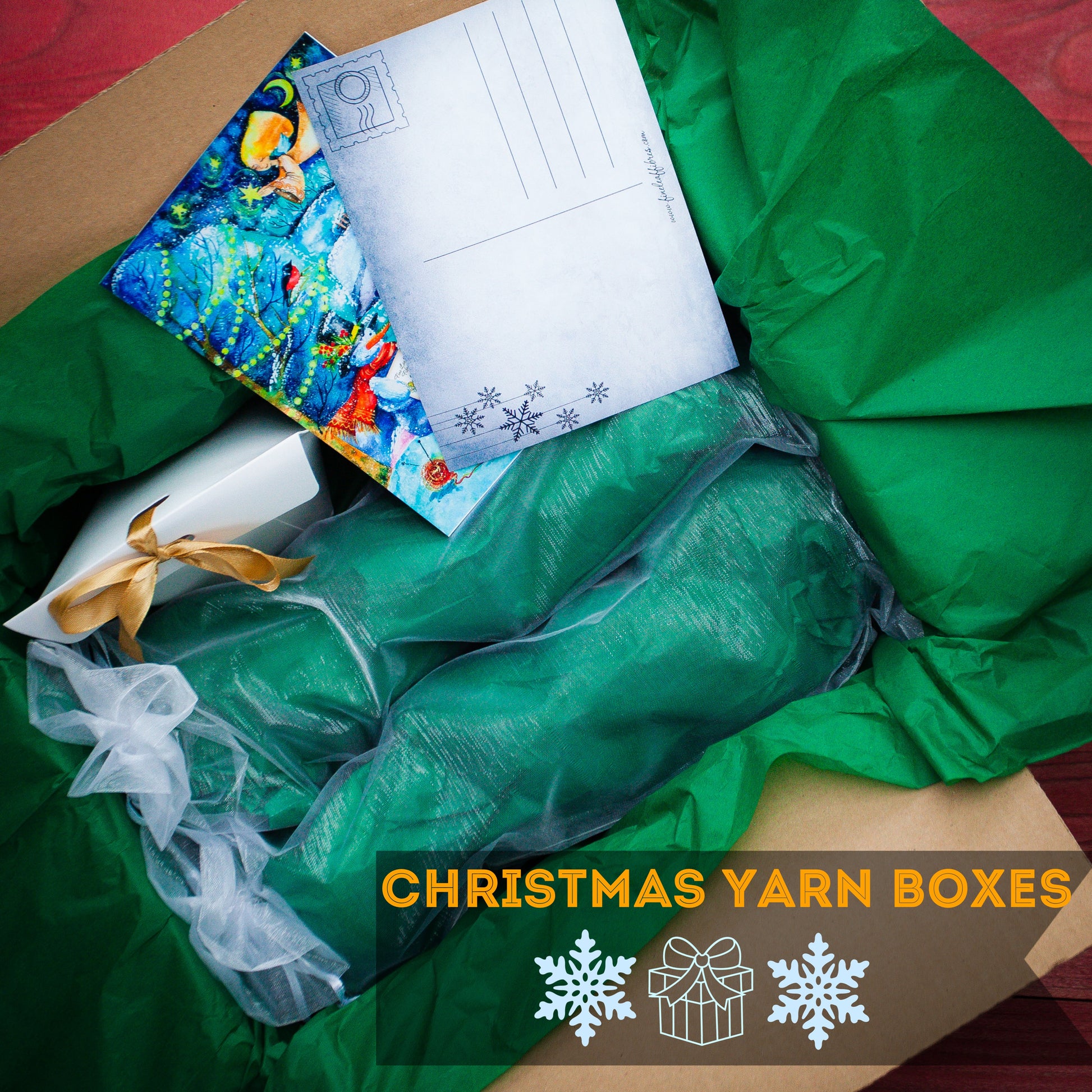 Each mystery box contains 2 full sized skeins of hand-dyed yarn, along with 2 festive postcards for your Christmas greetings and delightful small extras to add joy to your holiday season! 2 skeins are ideal for crafting a set of hat and mittens or a scarf.