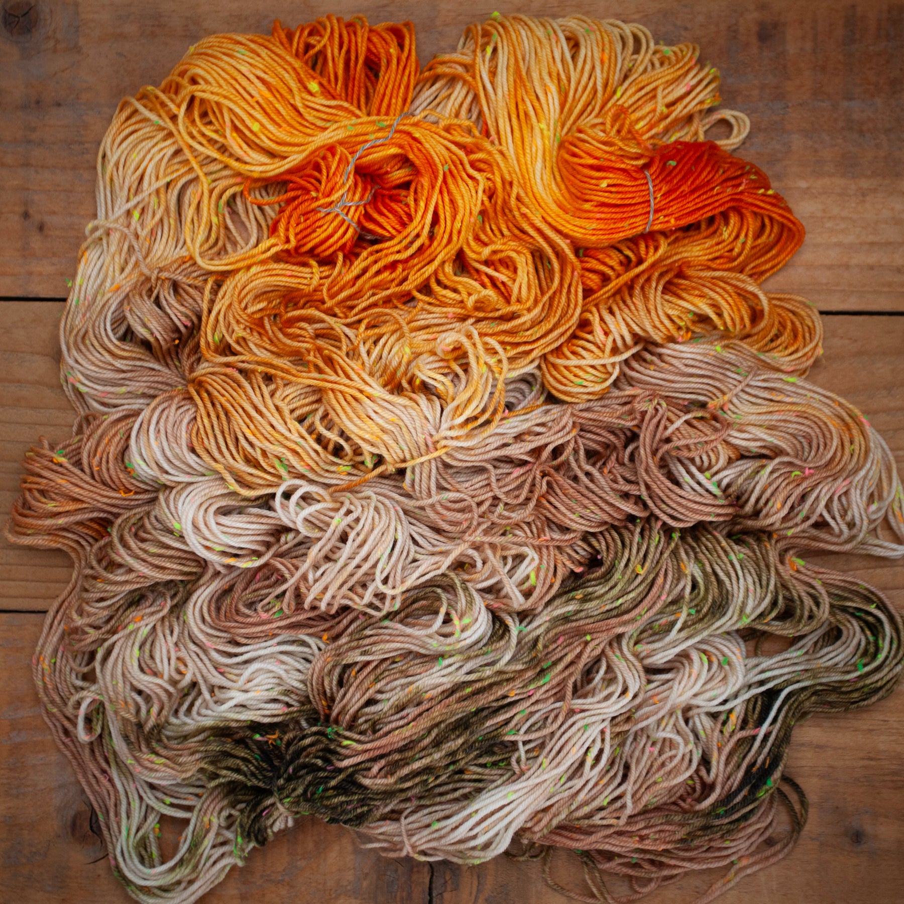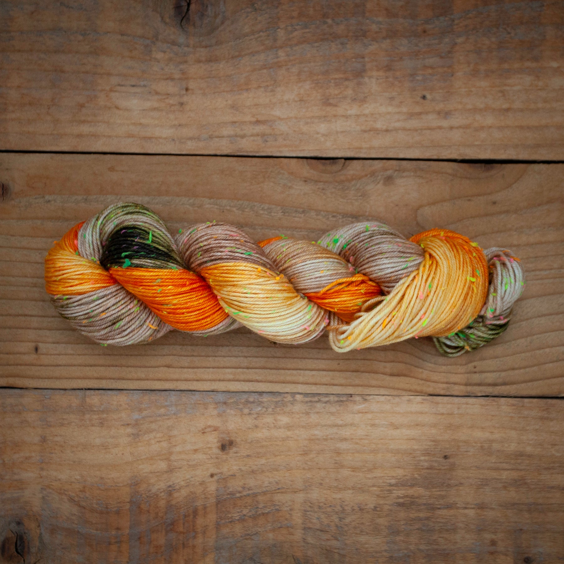 Superwash Merino yarn dyed in "Chanterelle Season" colourway with neon tweed specks in DK weight is a vibrant and playful yarn that combines the softness of Merino wool with eye catching pops of colour.